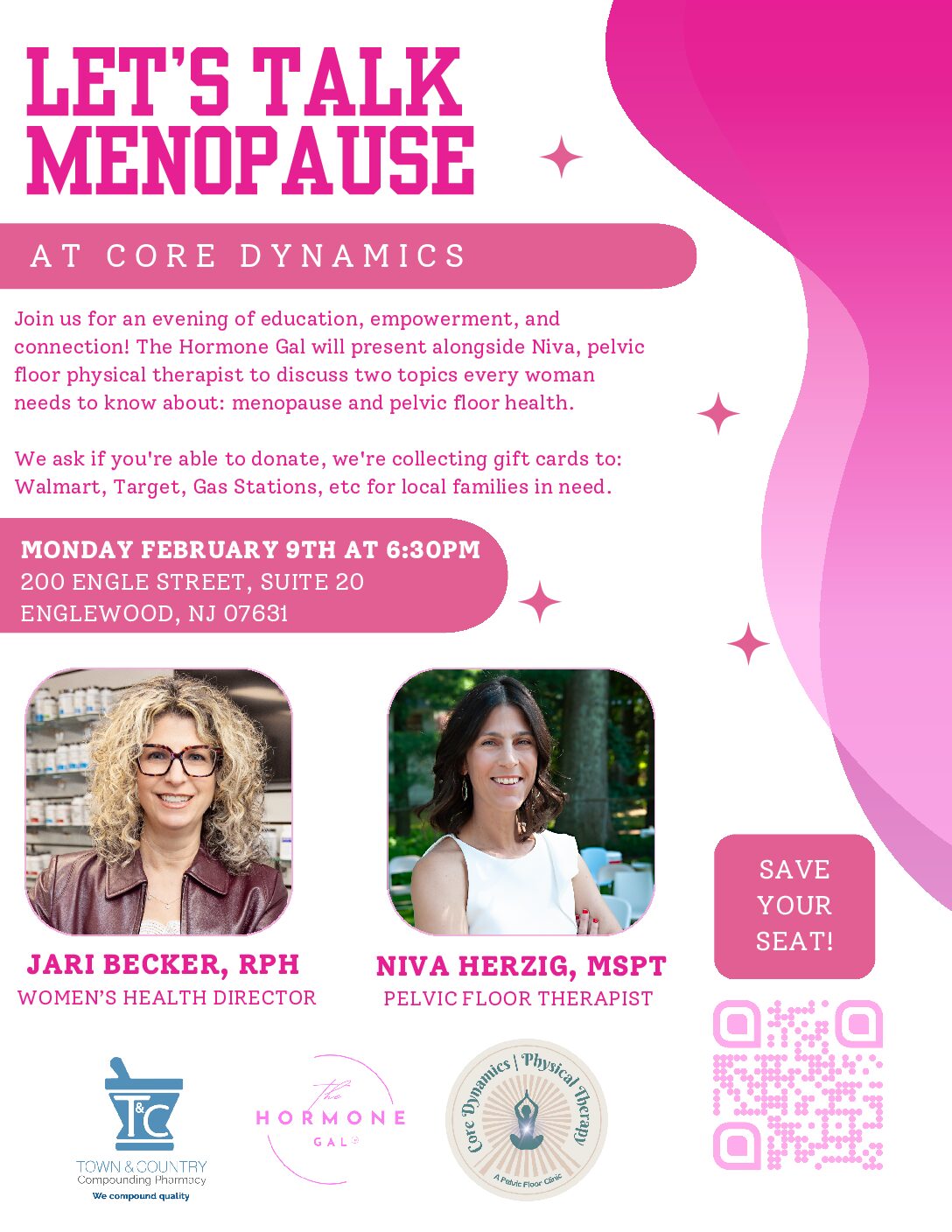 Core Dynamics PT 200 Engle Street, Englewood, NJ, United StatesEvent Timing: Monday February 9th at 6:30PM Event Address: Core Dynamics Physical Therapy 200 Engle Street, Suite 20 Englewood, NJ 07631 Questions? Contact us at [email protected] or [email protected] Follow our Instagram Pages @tccompound @the.hormone.gal @coredynamicsphysicaltherapy Let's Talk Menopause is an educational event series where women gather in a relaxed, welcoming environment to learn about hormone health, menopause, and wellness topics. Enjoy […]